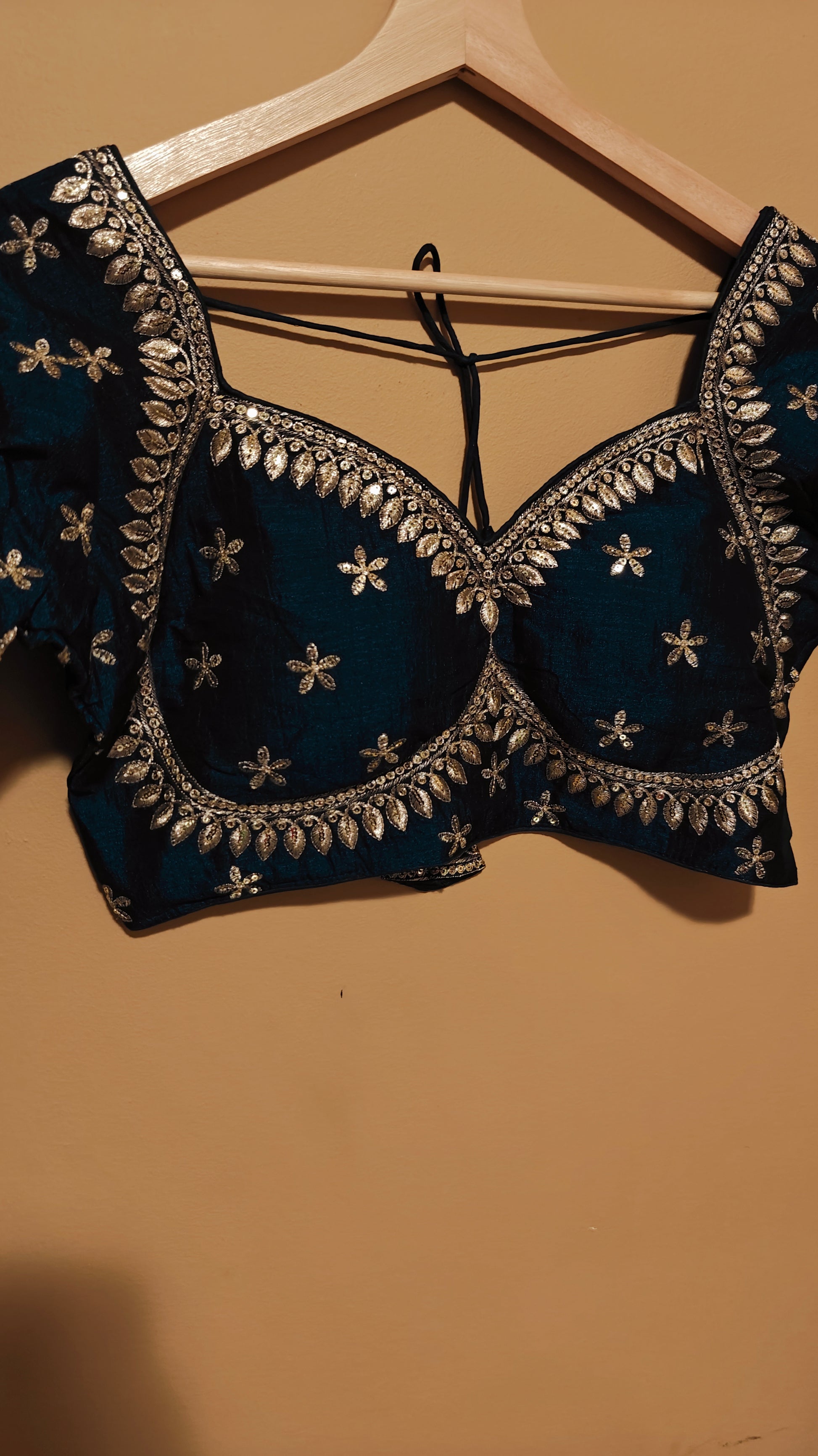 Upgrade your ethnic wardrobe with this stunning designer blouse, thoughtfully crafted to blend elegance and versatility. Perfectly tailored for a size 38 chest, it comes with an additional margin to adjust seamlessly for sizes up to 40 or 42, ensuring a custom fit that complements your style.
