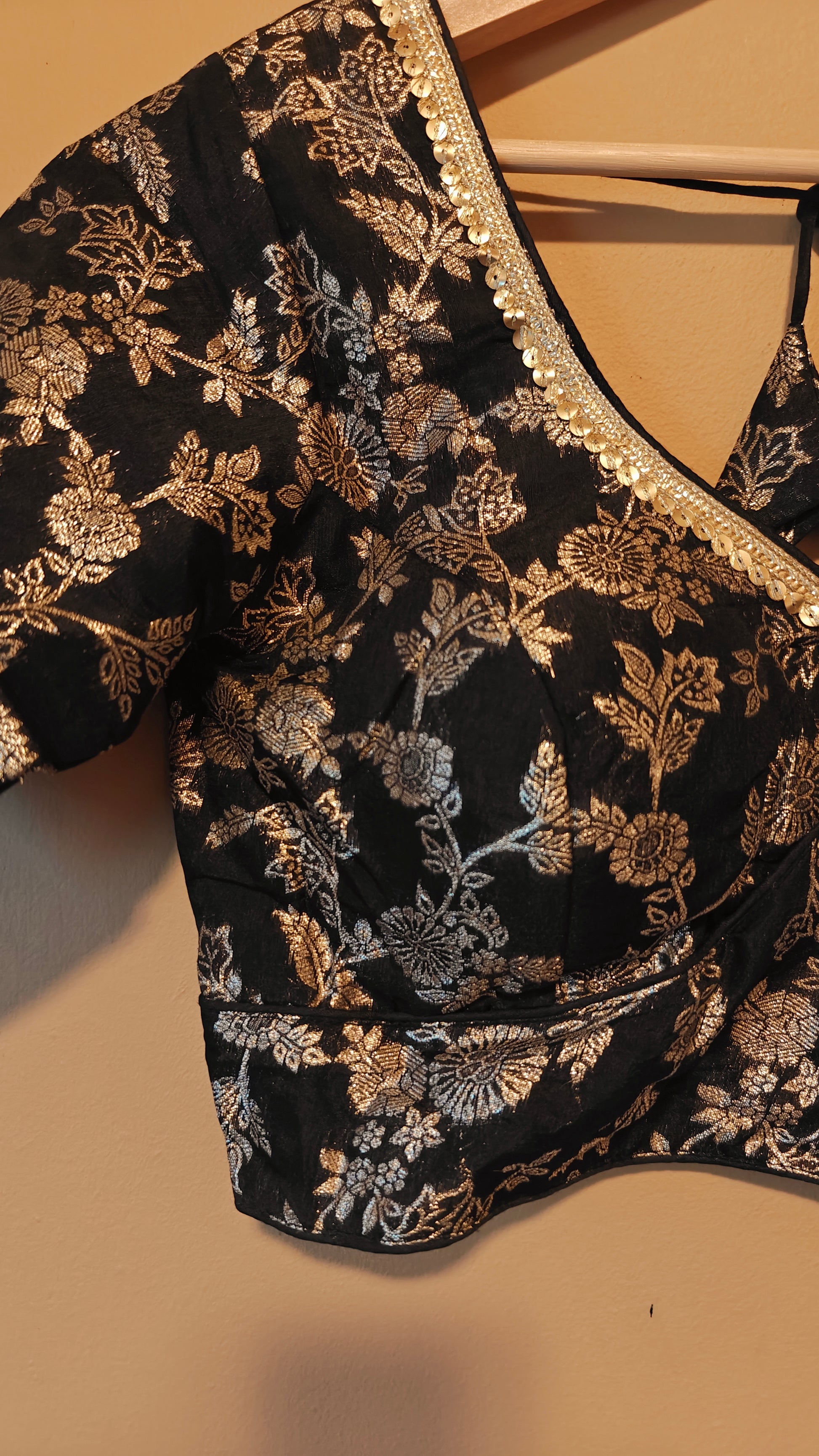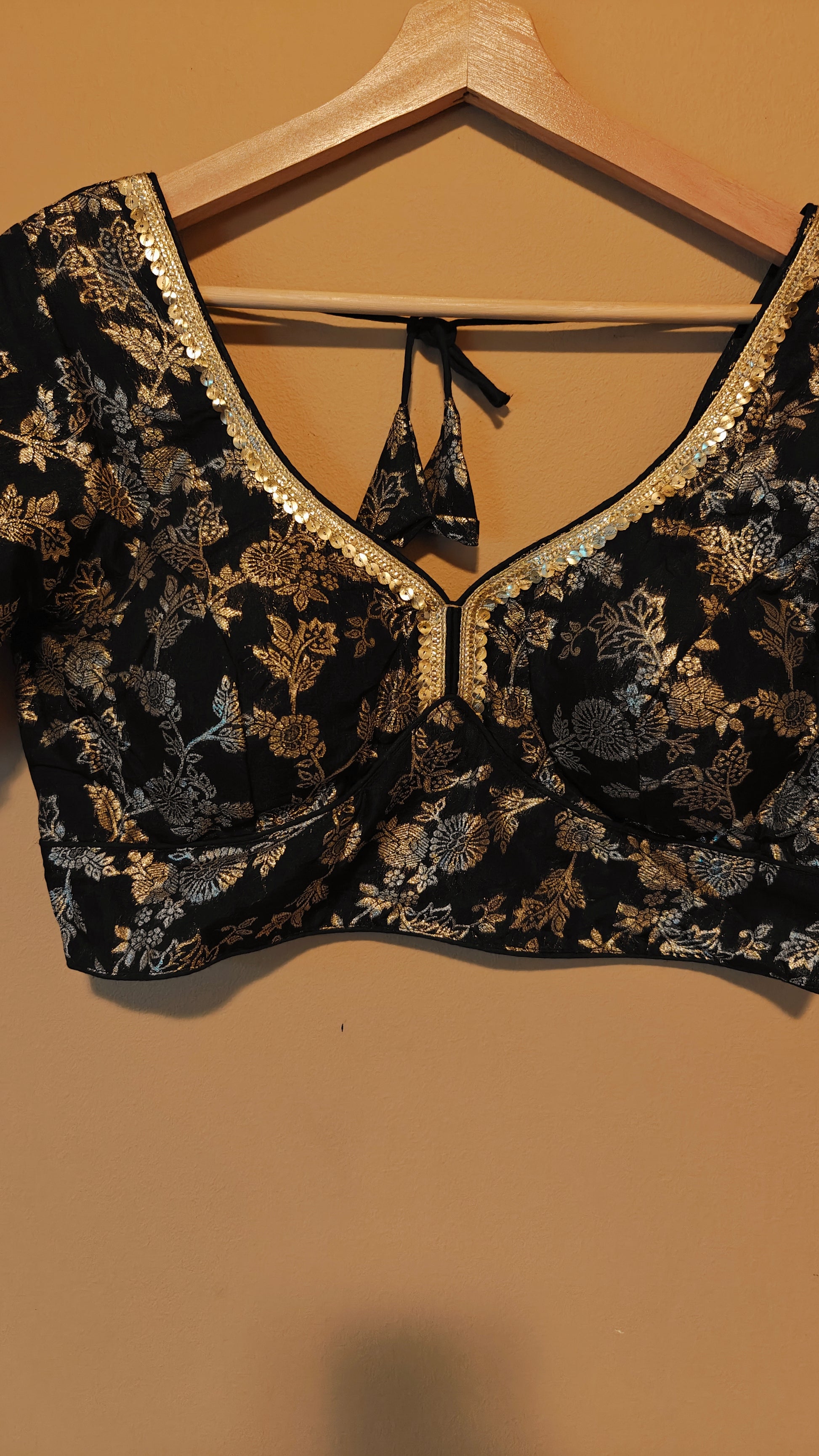 Upgrade your ethnic wardrobe with this stunning designer blouse, thoughtfully crafted to blend elegance and versatility. Perfectly tailored for a size M 38 chest, it comes with an additional margin to adjust seamlessly for sizes up to 40 or 42, ensuring a custom fit that complements your style.