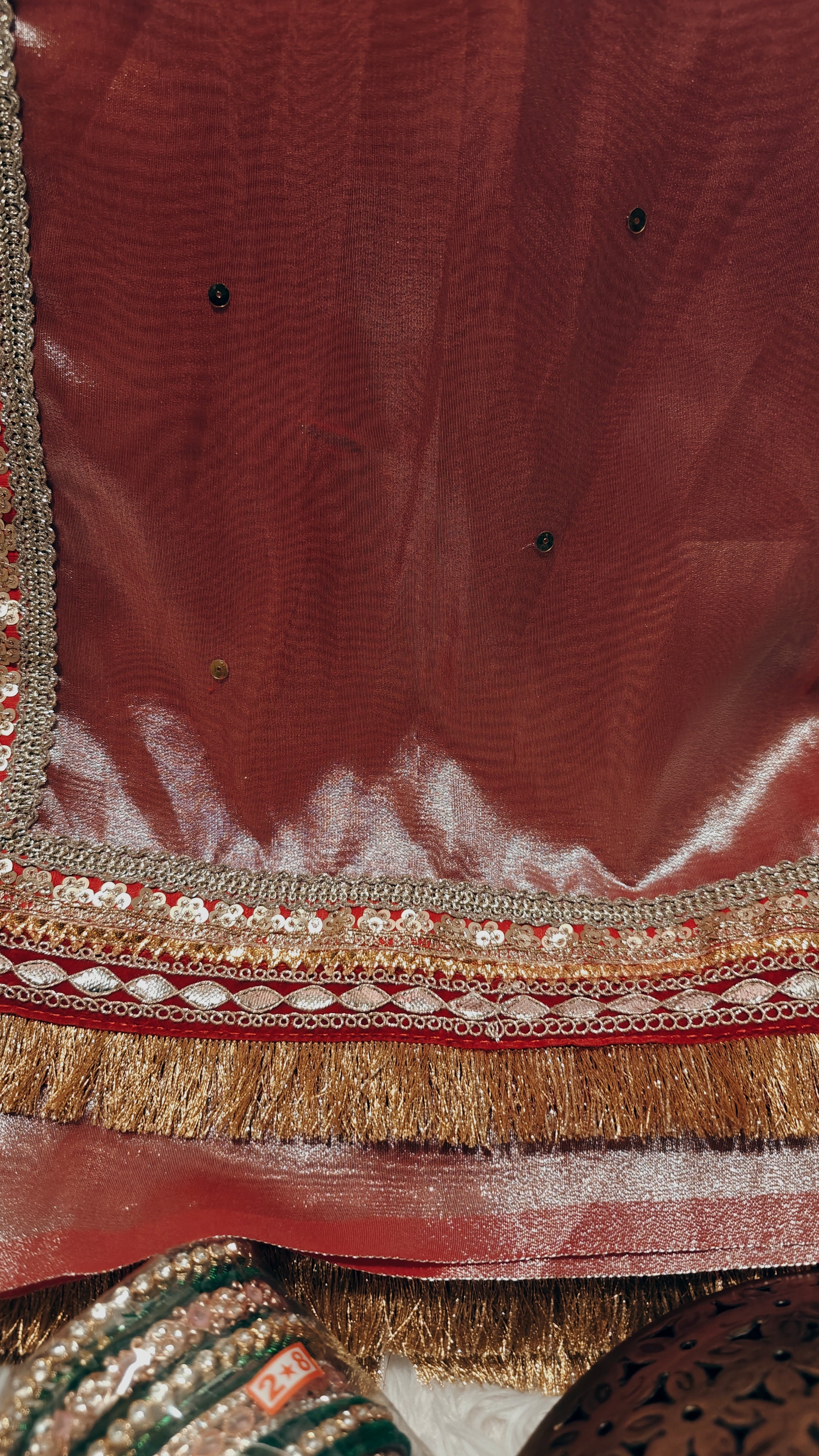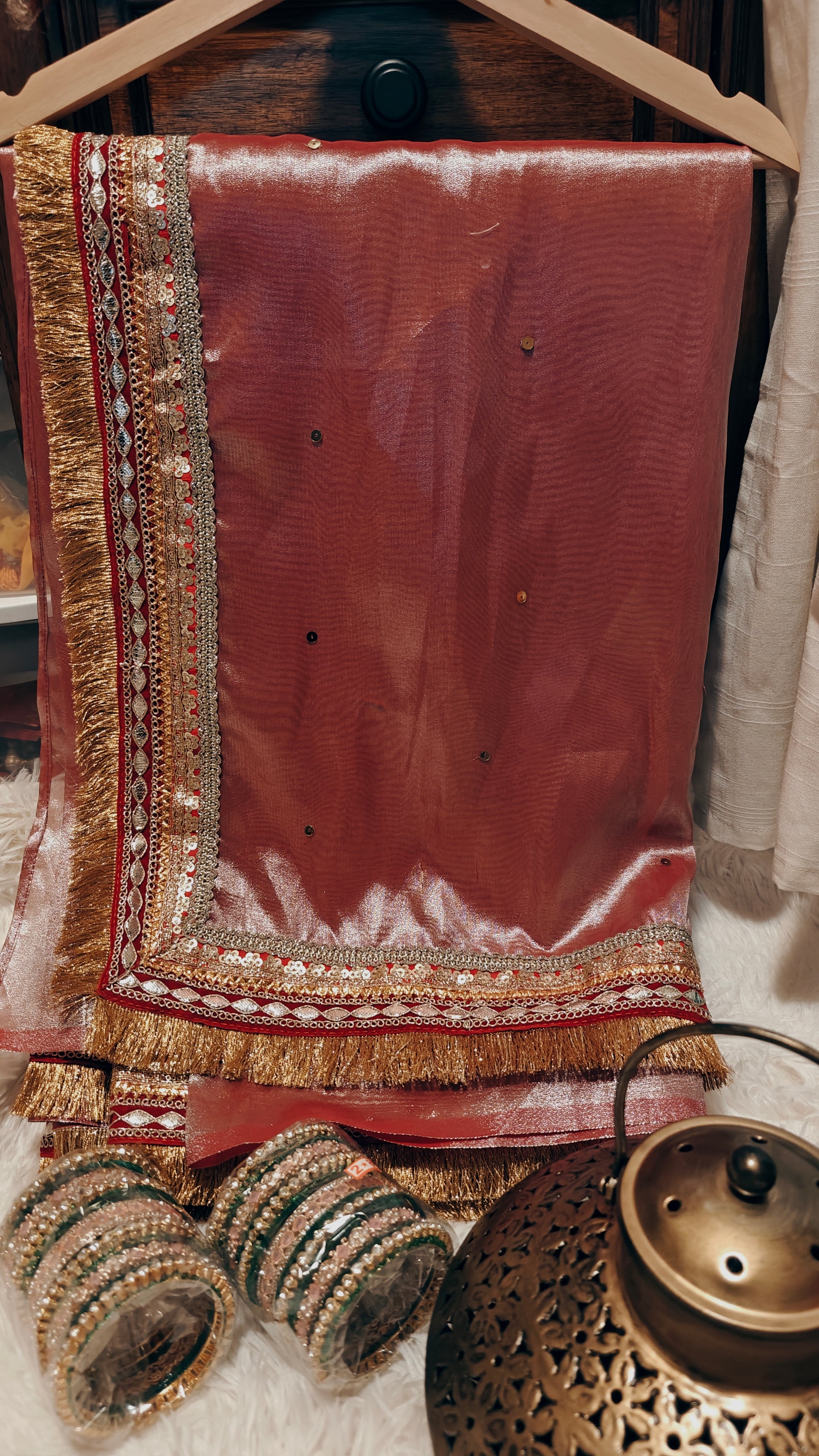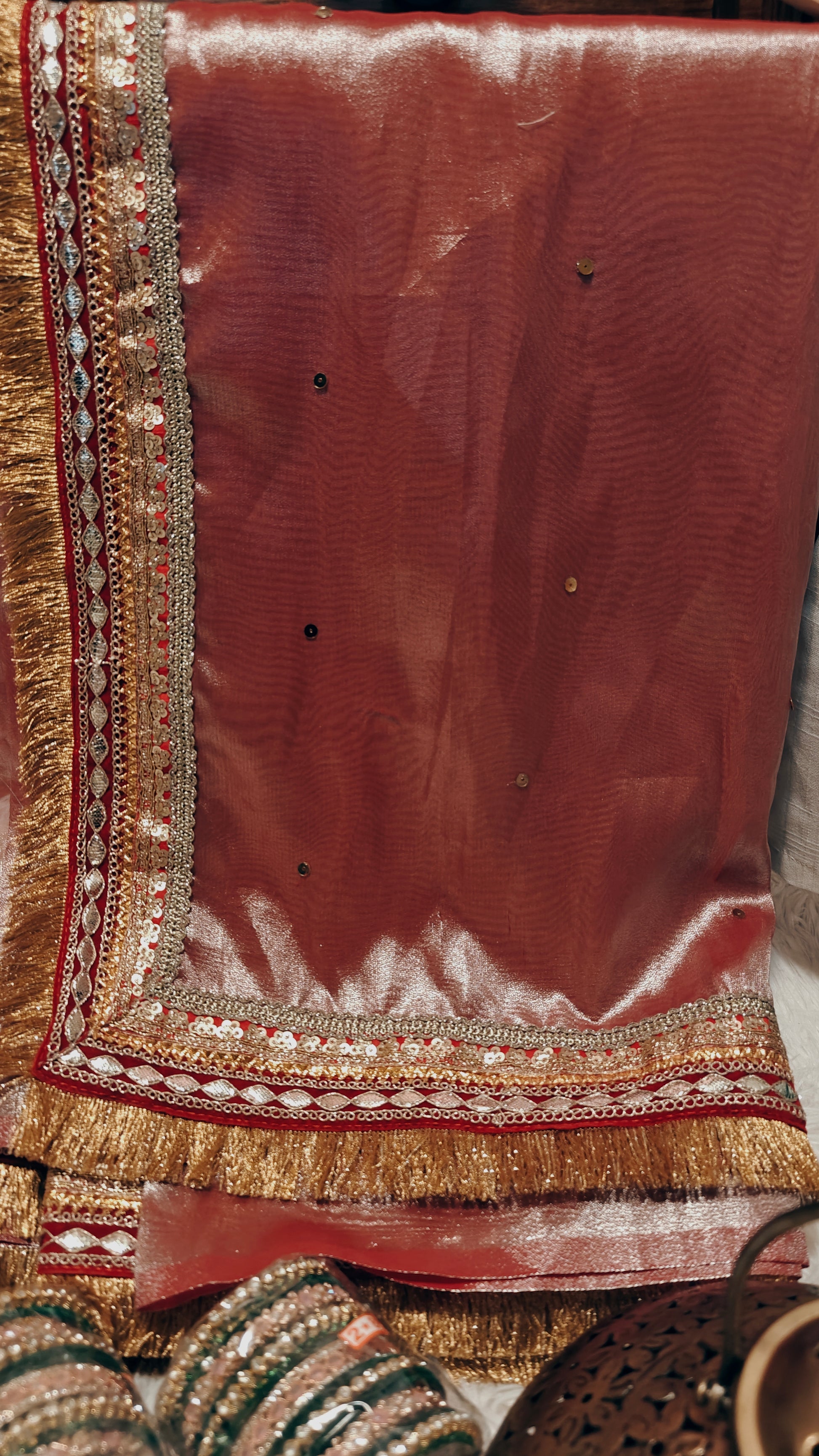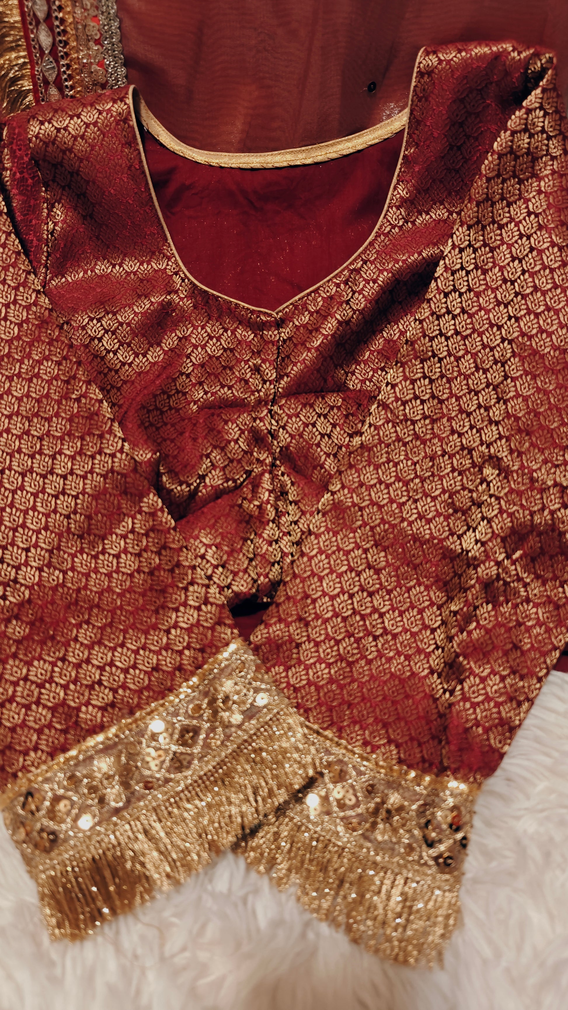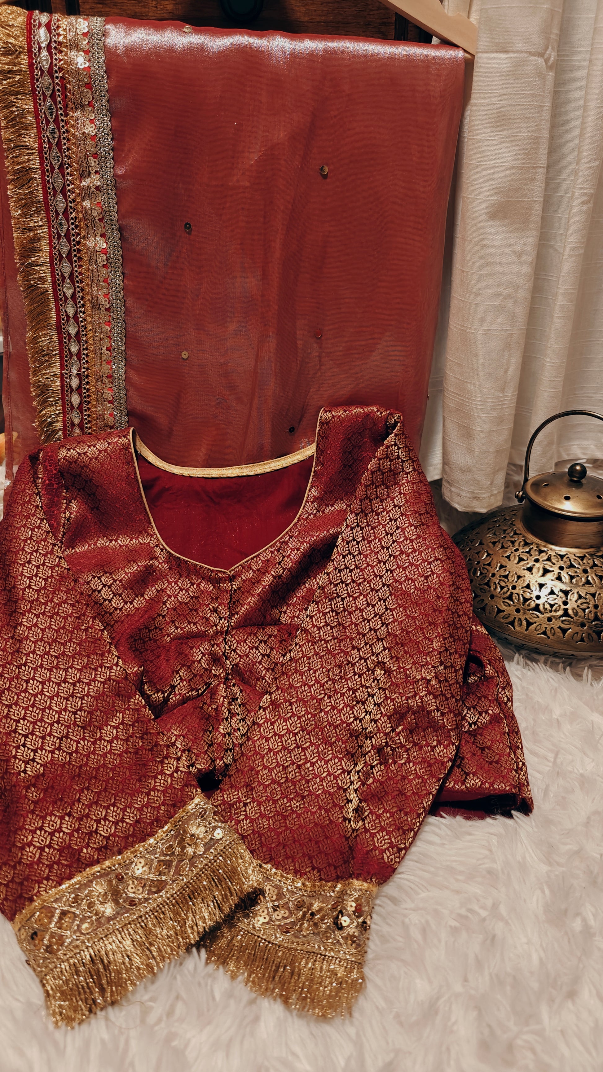 Expertly designed for a perfect fit, our Shimmer Gold Tissue Saree comes with a fully stitched blouse in size M (fits bust sizes 38/40). With extra margin to adjust up to size L (42), this stunning saree offers both comfort and style for any occasion.